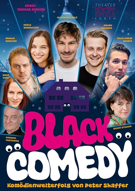 Nach einem Kurzschluss müsste die Bühne zwar eigentlich im Dunkeln liegen, doch die Lichtverhältnisse sind umgekehrt. Die Zuschauer sehen alle Ereignisse im hellen Licht, während die Schauspieler so spielen müssen, als ob sie im Dunkeln tappen würden. Brindsley, ein junger, brotloser Künstler träumt von einer großen Künstlerkarriere. Gemeinsam mit seiner Verlobten erwartet er den Besuch eines reichen Kunstmäzens. Um zu imponieren, hat er seine alten Möbel gegen die Antiquitäten seines verreisten Nachbarn Harold „ausgeliehen“. Die Sicherung knallt durch und dann tauchen die keineswegs abgeschriebene Ex-Freundin, die Schnapsdrossel von nebenan Miss Furnival sowie Nachbar Harold auf. Das Chaos scheint komplett. Reichlich im Dunkeln gemixte alkoholische Getränke sorgen für weitere Verwechslungen, bis das Licht wieder an- bzw. ausgeht.